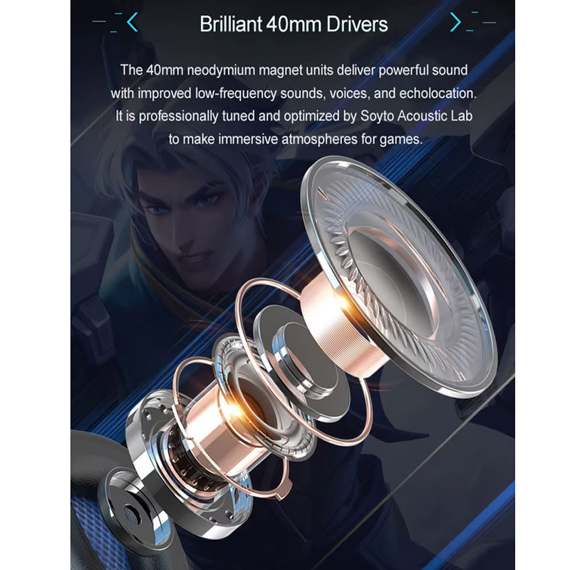 Auriculares estéreo con cable y diseño over-ear, optimizados para gaming en PC, PS4, PS5 y Xbox. Incorporan drivers de 40mm, micrófono integrado, control de volumen en el cable y una longitud de cable de 2.2m.