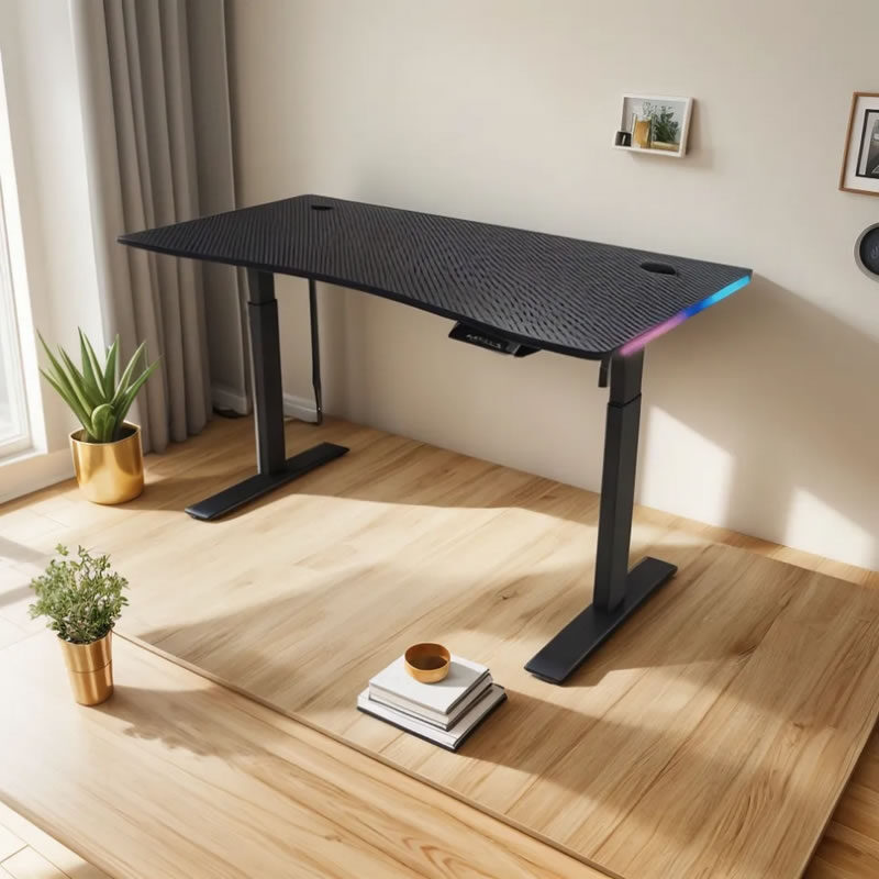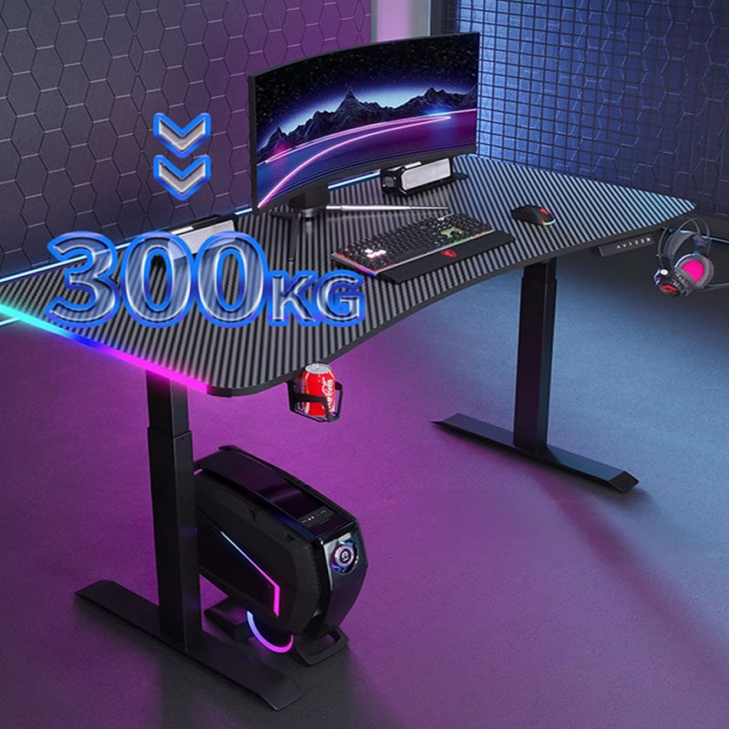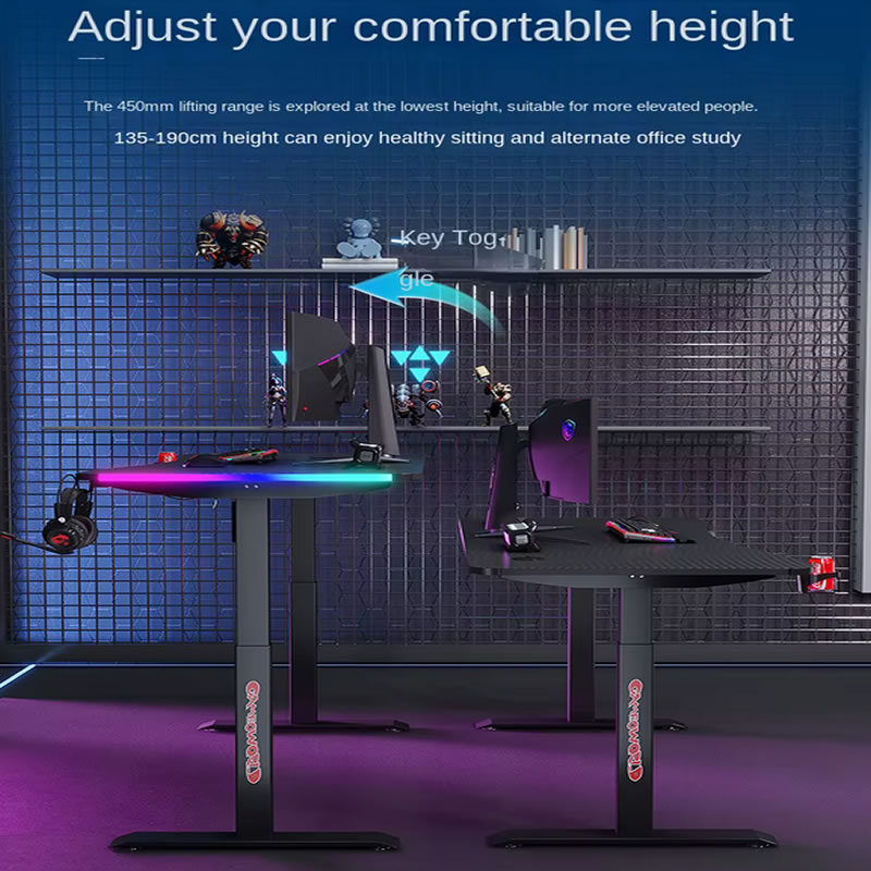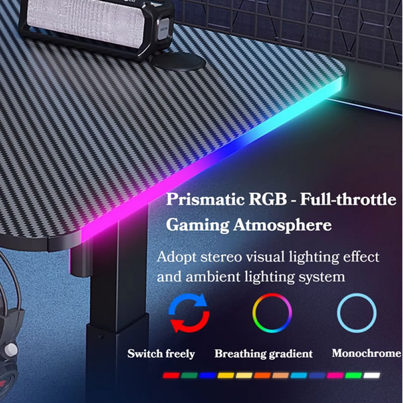 Este escritorio de gaming de alta calidad, diseñado para e-sports, siendo personalizable para adaptarse a diferentes espacios y necesidades. Su estructura está construida con materiales metálicos de alta calidad, garantizando una durabilidad y robustez excepcionales, capaces de soportar el equipo de PC y accesorios de gaming.