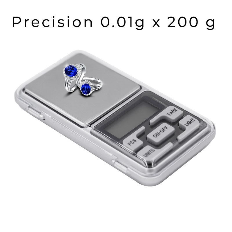 Gramera de joyería de alta precisión (0.01g x 200g) para pesar joyas, gemas y metales preciosos. Diseño compacto y portátil. ¡Precisión y confiabilidad en cada pesaje!
