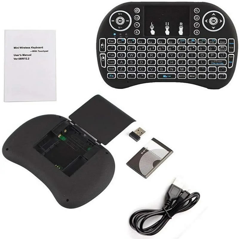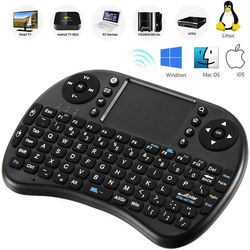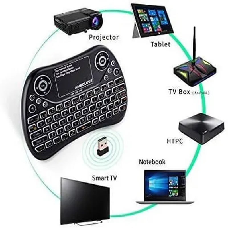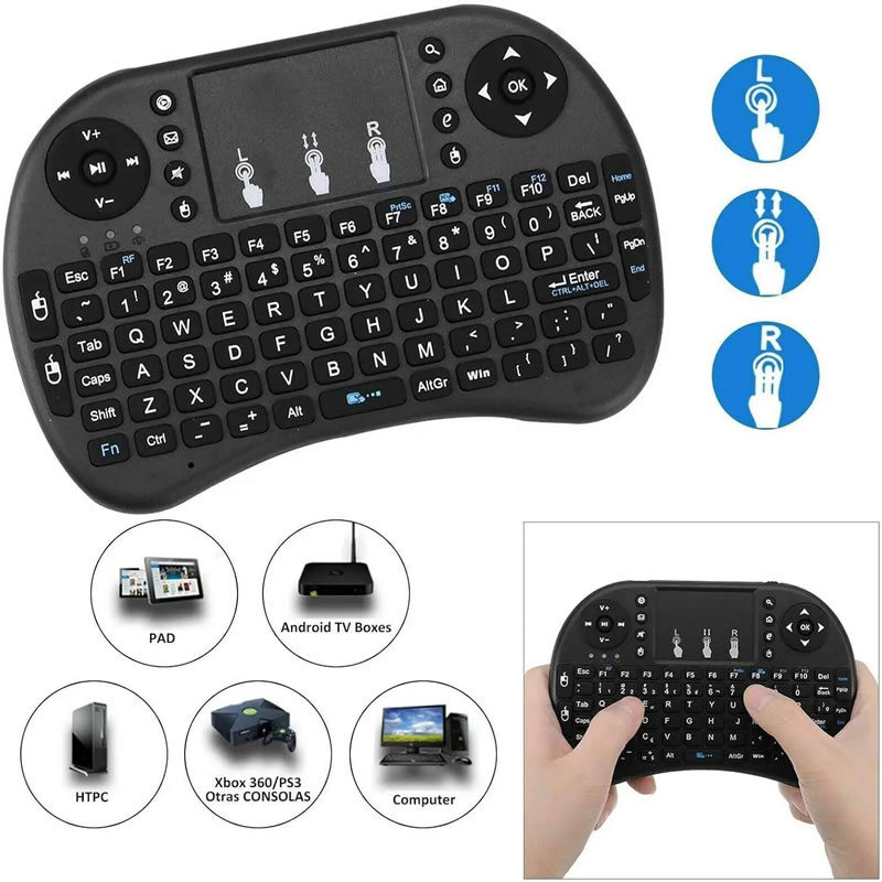 Teclado inalámbrico mini con panel táctil integrado, diseñado para ofrecer un control completo y cómodo de Smart TV, Android TV Box, computadoras, proyectores y otros dispositivos multimedia. Su diseño compacto y ergonómico permite escribir, navegar y controlar interfaces desde el sofá, escritorio o sala de entretenimiento sin necesidad de mouse adicional.